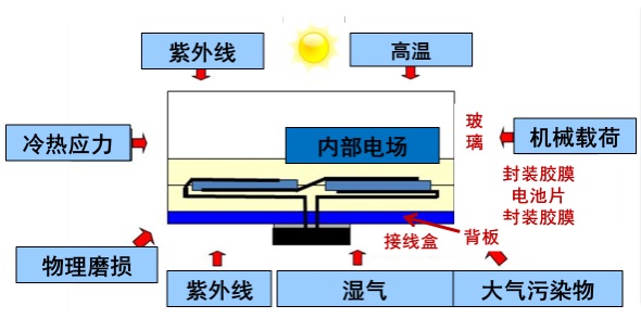 而作為組件來說,它的封裝系統需要為其提供絕緣保護,組件自身需要耐受各種外部環(huán)境應力長期化學和物理老化,而且組件內部電池片和電路材料還需要耐受機械應力以及內部電場和遷移到組件內部濕氣、氧氣、離子共同作用的電化學腐蝕。