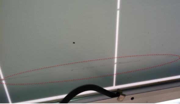 該案例為安裝于西班牙的一個2.3MW的光伏電站,使用了兩種組件類型,組件在戶外使用4年,所有PET聚酯背板都沿焊帶方向出現開裂。調查顯示,該電站的一些組件未通過濕漏電測試,而且該電站的所有者因為無法獲得更換的組件,直接導致組件失效。
