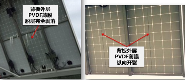 該案例是位于北美的4個地面光伏系統,2011年安裝,戶外運行4年。該背板外層PVDF薄膜發(fā)生縱向開裂,嚴重的已經剝落;其4個系統中PVDF背板發(fā)生該失效比例達到21%~85%。
