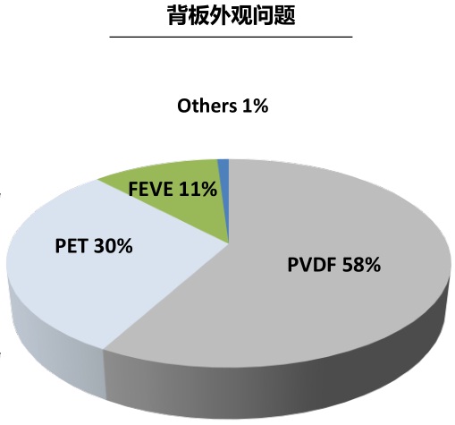 從背板外觀失效的組件中,按材料類型來分類,其中PVDF材料失效所占比例最高,達到58%,接下來是PET與FEVE,分別占到了30%和11%。