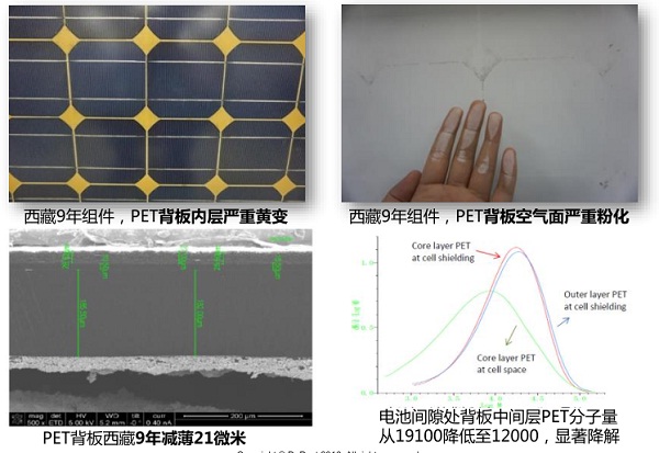 該案例是位于西藏的一個光伏電站,組件使用了9年,背板從內層看有非常嚴重的黃變,而且PET背板空氣面嚴重粉化剝落,厚度衰減嚴重,9年減薄了21微米;并且,電池間隙處背板中間層PET分子量從19100降低至12000,發(fā)生了顯著降解。