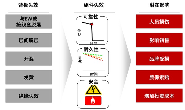 未經戶外實績驗證的材料將顯著影響組件的失效,這些組件的失效將從三個方面影響電站,第一是造成嚴重的功率衰減,使得光伏電站的可靠性大大降低。第二,未經戶外實績驗證的材料還會加速光伏組件的功率衰減,使得組件的耐久性減弱。第三,未經戶外實績驗證的材料使得組件的安全性成為了一個問題,增加了電站的運行風險以及投資風險。