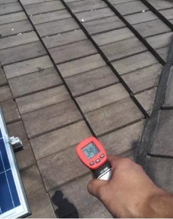 組件表面測得溫度為57.5度,我們用手觸摸,發(fā)現(xiàn)和屋面溫度接近,可能由于玻璃表面反光,導(dǎo)致測得溫度偏低。