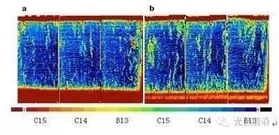 圖2所示為兩硅錠半截面少子壽命差異對(duì)比,圖中彩色區(qū)域代表由于雜質(zhì)、缺陷等引起的低少子區(qū)域??梢悦黠@看出有籽晶高效多晶硅錠低少子區(qū)域較少,而且分布均衡。而無(wú)籽晶高效多晶硅錠低少子區(qū)域分布較多,但是底部紅區(qū)高度明顯偏低。M.Trempa等通過(guò)一種高效阻擋層的實(shí)驗(yàn)[10]解釋了有籽晶高效多晶硅錠底部紅區(qū)較高的原因,他們認(rèn)為底部紅區(qū)是由于底部坩堝與籽晶雜質(zhì)擴(kuò)散的共同影響引起的。而無(wú)籽晶高效多晶硅技術(shù)僅僅只有坩堝雜質(zhì)的擴(kuò)散,因此底部紅區(qū)的高度相對(duì)較低。本文實(shí)驗(yàn)中有籽晶高效多晶硅錠剩余籽晶的高度為10mm左右,而底部紅區(qū)的高度為 55-60 mm之間,然而無(wú)籽晶高效多晶硅錠底部紅區(qū)高度僅僅為45mm左右,因此無(wú)籽晶高效多晶硅技術(shù)硅錠具有一定的良率優(yōu)勢(shì)。