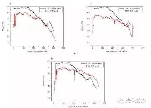 采用同一爐臺(tái),同種熱場(chǎng)。無(wú)籽晶高效多晶硅使用非硅材料作為異質(zhì)形核層,有籽晶高效多晶硅底部鋪設(shè)碎硅料作為籽晶,采用兩種技術(shù)分別各鑄造一個(gè)重量相同的多晶硅錠。