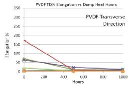 出現(xiàn)這些隱患的根源在于材料本身,通過測試及實際案例證明,PVDF薄膜除了本征橫向力學性能差的特點外,在紫外、濕熱、PCT或低溫老化測試中也發(fā)現(xiàn),其橫向斷裂伸長率可降到5%以下,大大提高了光伏組件在戶外使用開裂的風險。
