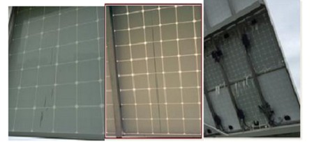 PVDF薄膜的橫向脆性導致其在戶外存在較高的開裂風險,一旦背板開裂代表絕緣性能失效,很容易引發(fā)漏電、電弧、火災等安全性事故,甚至導致人員與財產(chǎn)的損失。圖3是在北美地區(qū)戶外使用4年的PVDF背板形貌,平均開裂比例約57%,裂紋方向均沿縱向形成。