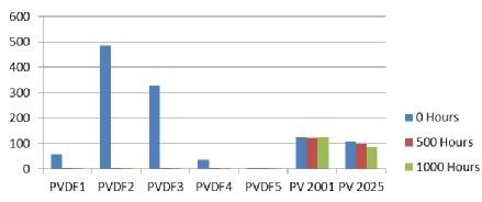 眾所周知,力學性能和耐候性是背板用氟膜最重要的性能,PVDF薄膜具有橫向斷裂伸長率低的缺陷,該問題已逐漸在測試和應用中暴露出來。雖然添加彈性體材料有助于PVDF薄膜在初始力學性能測試時由于拉絲效果顯示較高的斷裂伸長率,但是在輕微的老化測試后,所有PVDF薄膜橫向斷裂伸長率均低于10%,基本失去了高分子材料應有的韌性,極易開裂。而同樣測試條件下的PVF薄膜力學性能保持良好,仍然能維持60%以上的保持率(如圖1和圖2 )。