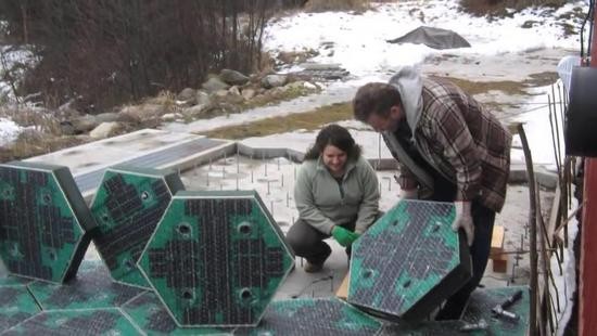 Brushaw夫婦于2013年啟動(dòng)試點(diǎn)項(xiàng)目,與荷蘭那條道路不同,他們將關(guān)注點(diǎn)聚焦在停車場(chǎng)路面上。因?yàn)橥\噲?chǎng)作為一個(gè)試驗(yàn)點(diǎn),空間大小足夠,并且能通過(guò)所發(fā)電量,部署LED光源。他們?cè)O(shè)計(jì)的太陽(yáng)能面板與眾不同,看上去像一個(gè)個(gè)特殊設(shè)計(jì)的六角形,整個(gè)停車場(chǎng)路面都由這種含有太陽(yáng)能組件的玻璃塊組成。最表面的透明玻璃所使用的材料叫低鐵玻璃,它不僅具有很高的透明度,還有很強(qiáng)的負(fù)荷力與牽引力。