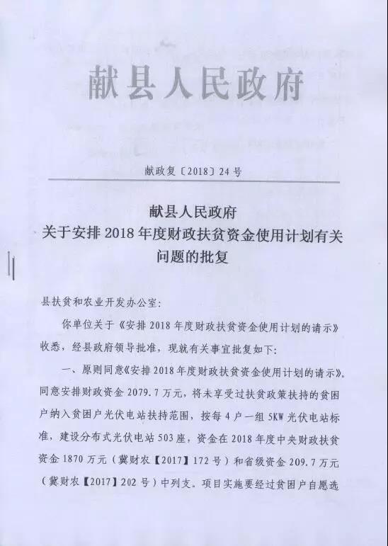 近日,河北滄州獻(xiàn)縣人民政府發(fā)布《關(guān)于安排2018年度財(cái)政扶貧資金使用計(jì)劃有關(guān)問題的批復(fù)》,其中指出,同意安排財(cái)政資金2079 7萬元,將未享