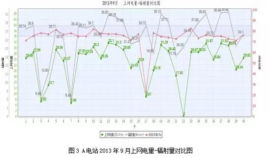 由圖2可見,2013年9月份,電站的綜合利用效率為72.1%,低于電站正常運(yùn)行范圍。統(tǒng)計(jì)光伏電站2013年9月的上網(wǎng)電量和輻射量數(shù)據(jù),計(jì)算2013年9月每日的綜合利用效率,繪制上網(wǎng)電量、輻射量和綜合利用效率對(duì)比圖,如圖3所示: