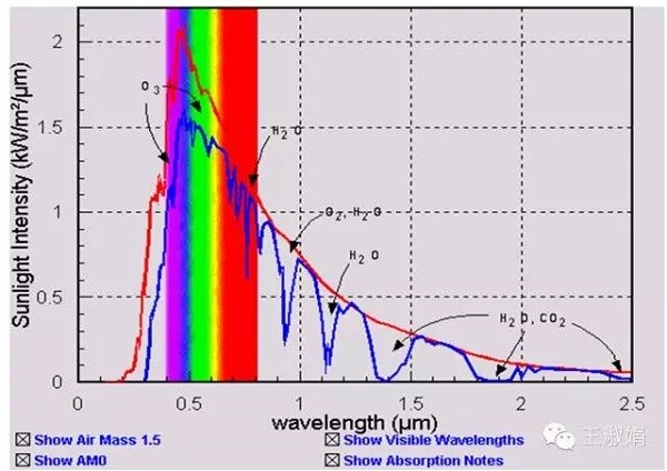 1、太陽光譜和能量分布圖是基于黑體輻射理論所得,AM1.5和大氣層外光譜圖的差別是因為大氣層中的氣體和塵埃吸收及散射、反射等所致。