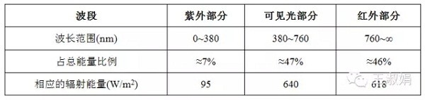 而在AM1.5條件下,紫外部分輻射能量約占2%,可見光部分和紅外部分占比基本一樣,各約49%。
