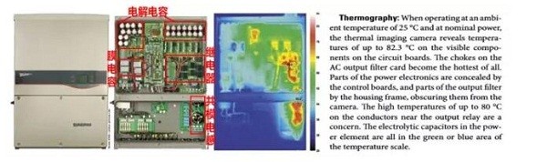 ●采用單層結(jié)構(gòu)的組串式逆變器。Photon于2013年2月公布了國內(nèi)某知名廠家采用強制風(fēng)冷散熱的組串式逆變器測試結(jié)果,機器內(nèi)部最高溫度點在共模電感(82.3℃)。該廠家的組串式逆變器內(nèi)部采用單層結(jié)構(gòu)設(shè)計,熱成像儀可測得內(nèi)部大部分部件的溫度。