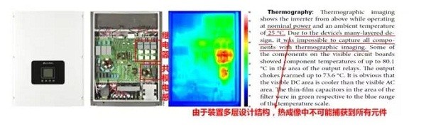 ●采用多層結(jié)構(gòu)設(shè)計的組串式逆變器,熱成像儀只能測得機器內(nèi)部部分器件溫度,無法測得所有部件的溫度,如核心器件模塊,電抗等;