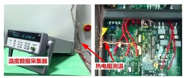 不同逆變器產(chǎn)品溫升對比,應(yīng)保證逆變器工作于相同環(huán)境溫度、相同工況下,采用熱電阻或熱電偶等接觸測溫方法對機器內(nèi)部關(guān)鍵元器件進行測量,如圖5。該方法為標準測試法。