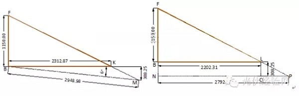 第二步畫出以直角邊長度1.15m和2.20231m的直接三角形,參考圖8,測量出圖7光線和坡面的交點M距離遮擋物最低點所在水平面的高度,本案例量測的高度為0.30825m。過L點作高度為0.30825m的線段LQ,過Q作水平線與斜邊FL的延長線交于P點,過P點作PN垂直于直角邊FB,則PN為X’分量長度,本例實測長度2.79262m,與理論計算值吻合。