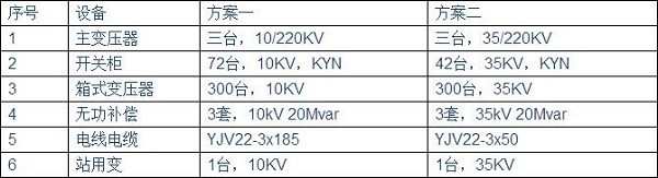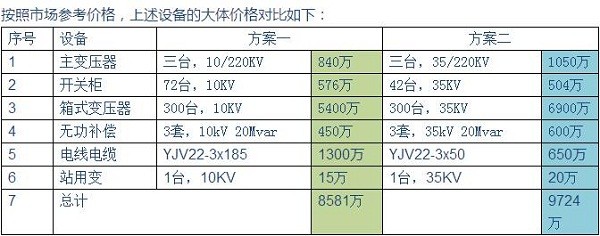 通過上表可知,10KV方案的投資要比35KV方案少1200萬左右,主要體現(xiàn)在箱式變壓器的價(jià)格方面。