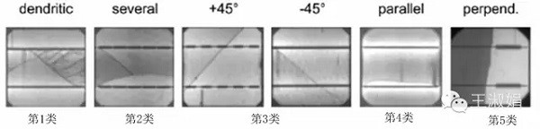 2011年,德國ISFH公布了他們的研究結(jié)果:根據(jù)電池片隱裂的形狀,可分為5類:樹狀裂紋、綜合型裂紋、斜裂紋、平行于主柵線、垂直于柵線和貫穿整個電池片的裂紋。