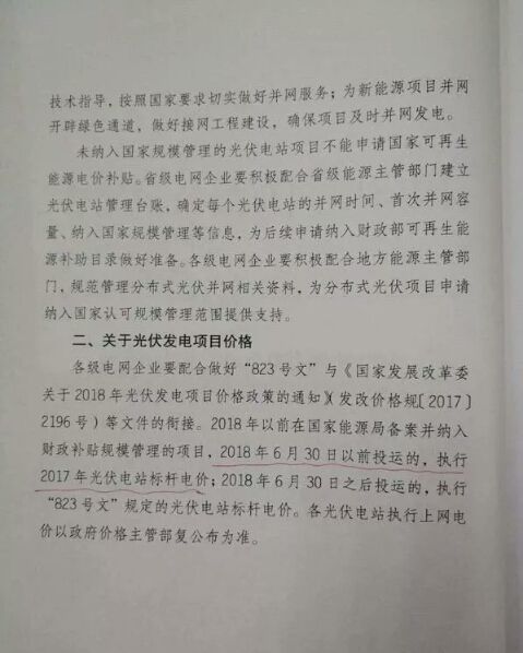 國(guó)家電網(wǎng)有限公司的這份文件中明確,2018年以前在國(guó)家能源局備案并納入財(cái)政補(bǔ)貼規(guī)模管理的項(xiàng)目,2018年6月30日以前投運(yùn)的,執(zhí)行2017年光伏電站標(biāo)桿電價(jià);2018年6月30日之后投運(yùn)的,執(zhí)行“823號(hào)文”規(guī)定的光伏電站標(biāo)桿電價(jià)(如下圖所示)。