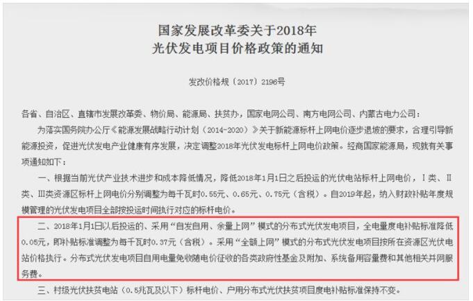 除此之外,國(guó)家發(fā)展改革委在2017年12月19日印發(fā)的《關(guān)于2018年光伏發(fā)電項(xiàng)目?jī)r(jià)格政策的通知》的文件中也明確,2018年1月1日以后投運(yùn)的分布式光伏發(fā)電項(xiàng)目執(zhí)行2018年新的標(biāo)桿電價(jià)(如下圖所示),即三類(lèi)資源區(qū)分別對(duì)應(yīng)的是0.55、0.65和0.75元/千瓦時(shí)。因此,即便分布式有630的說(shuō)法也應(yīng)該是執(zhí)行2018年的標(biāo)桿上網(wǎng)電價(jià)而不是2017年的。