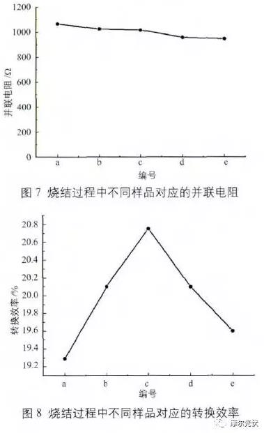 PERC電池的并聯(lián)電阻在燒結(jié)曲線變化的過(guò)程中基本保持穩(wěn)定,轉(zhuǎn)換效率隨著鋁硅合金層厚度的增加而上升,隨著氮化硅保護(hù)層被鋁漿燒穿而迅速降低。