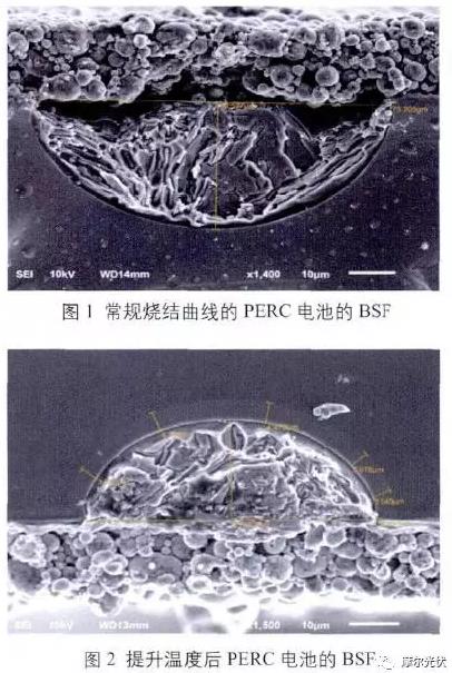 由于PERC電池專(zhuān)用鋁漿使用了弱刻蝕性的玻璃體,所以相對(duì)與常規(guī)電池的燒結(jié)曲線,鋁漿燒結(jié)區(qū)需要升高溫度才能獲得良好的鋁硅合金層(BSF)。過(guò)高的峰值溫度會(huì)導(dǎo)致鋁漿燒穿Al2O3上的SixNy保護(hù)層,破壞Al2O3的鈍化效果,形成額外的導(dǎo)電通道,開(kāi)路電壓、短路電流、串聯(lián)電阻與轉(zhuǎn)換效率均會(huì)大幅降低,但并聯(lián)電阻相對(duì)保持穩(wěn)定。PERC電池的燒結(jié)既需要足夠高的溫度來(lái)保證鋁漿與硅片充分反應(yīng),又需要將燒結(jié)溫度限制在一定范圍內(nèi),以保證鋁漿不會(huì)燒穿Al2O3上的SixNy保護(hù)層。