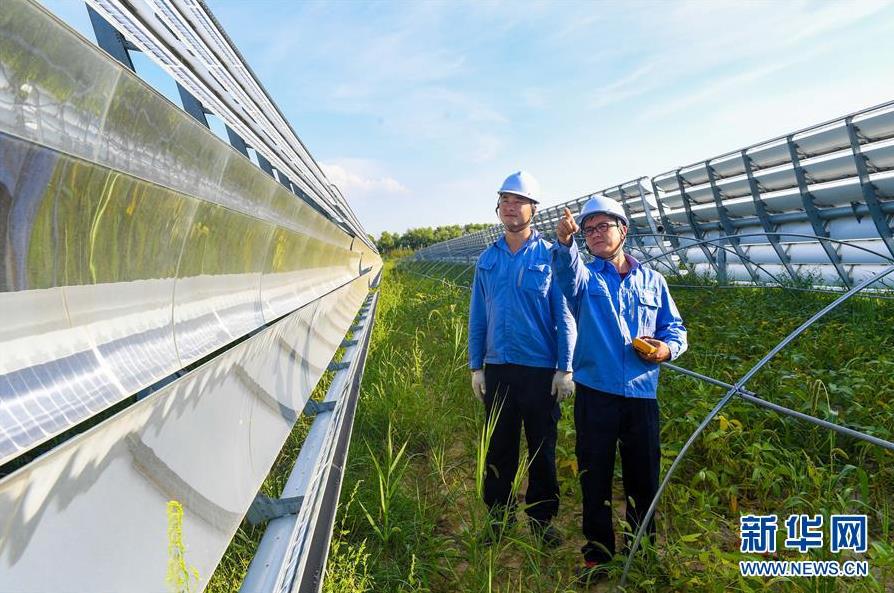 8月16日,在呼和浩特市賽罕區(qū)設(shè)施農(nóng)業(yè)20MW光伏電站示范項(xiàng)目,兩位工作人員在檢查光伏發(fā)電設(shè)施的運(yùn)行情況。