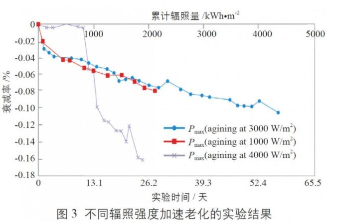 實驗條件:保證70 ℃恒溫,濕度保持在40%~80% 之間循環(huán),分別將3 塊組件恒定在1000 W/m2、3000 W/m2、4000 W/m2 的輻照強度下對組件進行測試,實驗結(jié)果如圖3 所示。