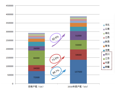 目前中國多晶硅產(chǎn)能主要集中在新疆、內蒙、江蘇、四川等地區(qū),產(chǎn)能集中度達到73.6%,隨著產(chǎn)能逐漸向資源優(yōu)勢地區(qū)轉移,到2018年底,新疆、內蒙地區(qū)多晶硅產(chǎn)能相較2017年底分別將有89.7%和73.5%的提升。四川因水電系清潔能源的優(yōu)勢,產(chǎn)能也有92.6%的提升。