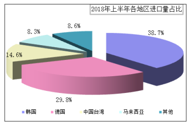 分國別來看:2018年上半年,自韓、德、臺、馬這四個地區(qū)進口量63166噸,占總進口量的91.4%,進口量占比分別為38.7%、29.8%、14.6%、8.3%,韓國進口量仍居首位。