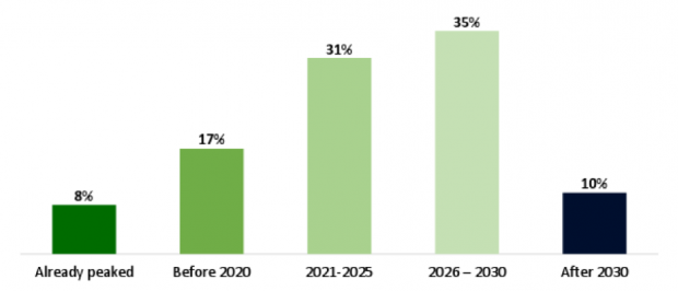 中國(guó)已經(jīng)承諾將在2030年達(dá)到碳排放峰值。調(diào)查顯示,90%的受訪者認(rèn)為這個(gè)目標(biāo)可以實(shí)現(xiàn),55%的受訪者認(rèn)為在2025年甚至更早就能實(shí)現(xiàn)這個(gè)目標(biāo)。有趣的是,8%的受訪者估計(jì)中國(guó)的碳排放已經(jīng)達(dá)到峰值。近日由全球碳預(yù)算(Global Carbon Budget)提供的數(shù)據(jù)顯示,去年以來中國(guó)的碳排放可能上升了約3.5%,但是令人鼓舞的是,有越來越多的利益相關(guān)方認(rèn)為中國(guó)會(huì)在2030年之前達(dá)到碳排放峰值。
