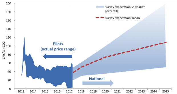 盡管如此,2017年的調(diào)查顯示,受訪者仍然相信碳價(jià)會(huì)走高。平均來看,他們預(yù)計(jì)在全國(guó)碳交易市場(chǎng)正式啟動(dòng)后,碳價(jià)會(huì)比現(xiàn)有7個(gè)試點(diǎn)市場(chǎng)的平均價(jià)格水平(38元/噸,約合5.8美元/噸)要高,會(huì)在2020年和2025年分別達(dá)到74元/噸(約合11美元/噸)和108元/噸(約合16美元/噸)。