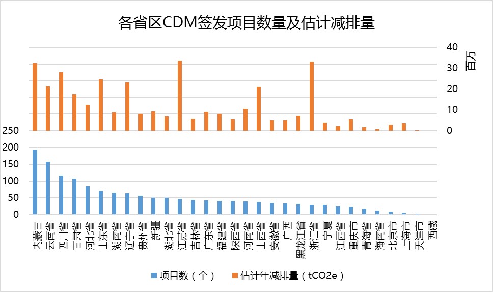 圖  各省區(qū)CDM簽發(fā)項(xiàng)目數(shù)量及估計(jì)減排量