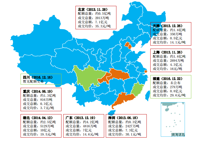 2011年起,先后在北京市、天津市、上海市、重慶市、廣東省、湖北省、深圳市啟動(dòng)7個(gè)碳交易試點(diǎn),探索建立碳交易機(jī)制,穩(wěn)步推進(jìn)制度設(shè)計(jì)、能力建設(shè)、人員培訓(xùn)等方面的工作,取得了初步成效。