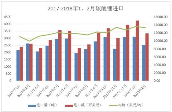 2018年2月中國(guó)碳酸鋰進(jìn)口2517.09噸,同比減少4.36%,環(huán)比減少19.16%,離岸進(jìn)口均價(jià)13283.27美元/噸,環(huán)比下降3%,同比上升34%。2月傳統(tǒng)春節(jié),部分下游廠商停止采購(gòu),導(dǎo)致碳酸鋰進(jìn)口有所下降。