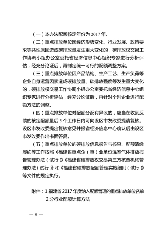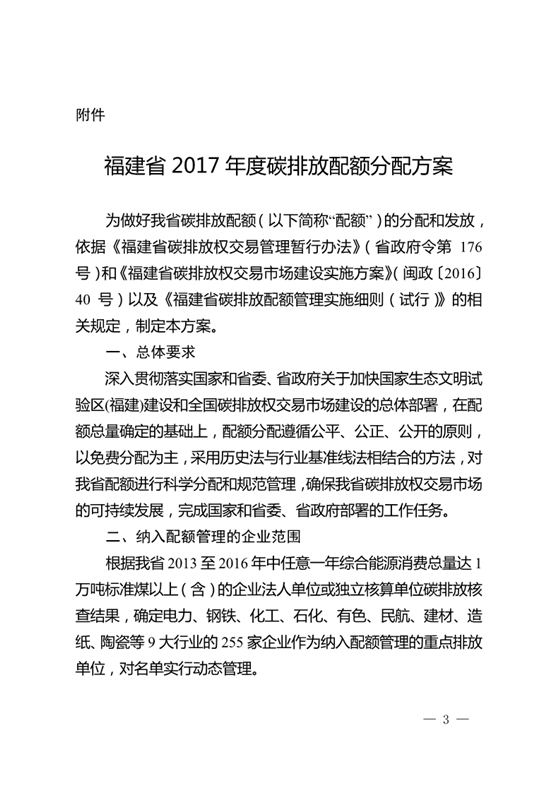 根據(jù)《福建省碳排放權(quán)交易管理暫行辦法》(省政府令第176號)和《福建省碳排放權(quán)交易市場建設(shè)實施方案》(閩政﹝2016﹞40號)要求,我委牽頭起草了《福建省2017年度碳排放配額分配方案》。經(jīng)省政府同意,現(xiàn)印發(fā)給你們,請遵照執(zhí)行。