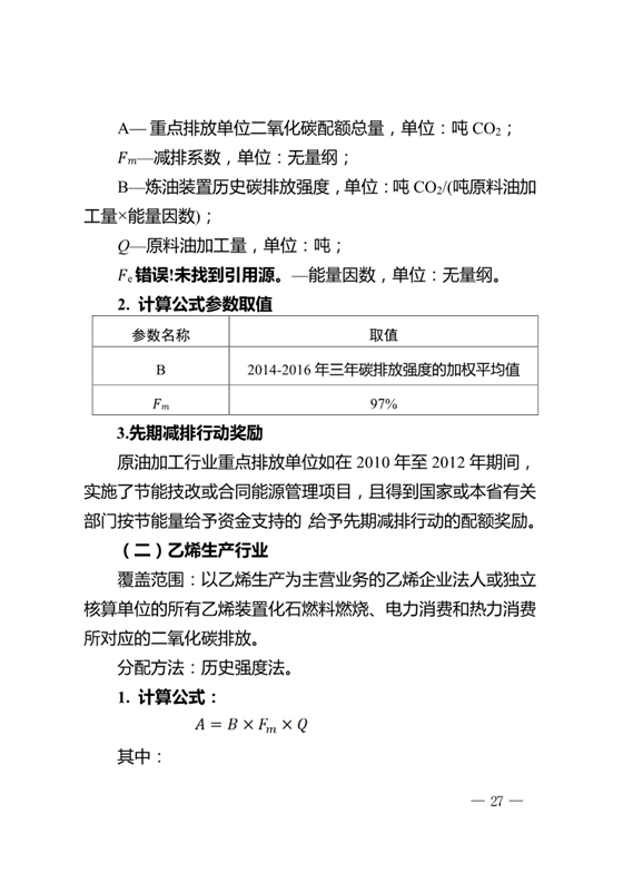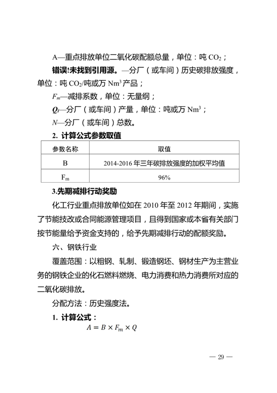 (二)歷史強度法:電網(wǎng)、銅冶煉、鋼鐵、化工、原油加工、乙烯、紙漿制造、機制紙和紙板、航空旅客運輸、航空貨物運輸、機場、建筑陶瓷、日用陶瓷及衛(wèi)生陶瓷等行業(yè)重點排放單位采用歷史強度法,公式如下:重點排放單位配額=歷史強度值×減排系數(shù)×產(chǎn)量