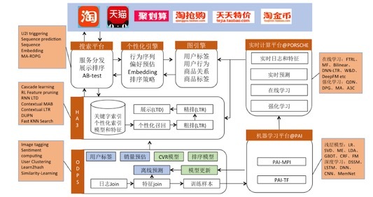 c. 流式計(jì)算和在線學(xué)習(xí)平臺(tái) Porsche,流式計(jì)算是基于blink負(fù)責(zé)實(shí)時(shí)日志解析和特征join生成實(shí)時(shí)排序特征,在線學(xué)習(xí)和離線學(xué)習(xí)底層框架可以相同,差別主要是依賴數(shù)據(jù)源和部分優(yōu)化方法不同,由于用戶行為和市場(chǎng)環(huán)境變化快,流式計(jì)算和在線學(xué)習(xí)在搜索應(yīng)用非常廣泛,并積累了不少在線學(xué)習(xí)和強(qiáng)化學(xué)習(xí)算法;