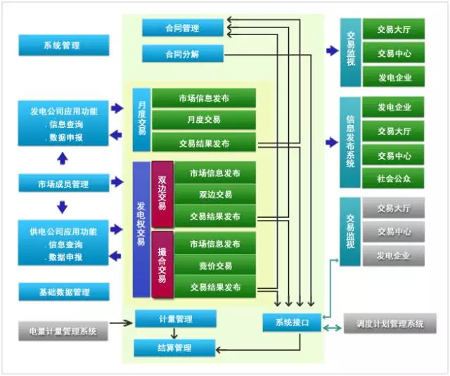 電力市場(chǎng)交易運(yùn)營(yíng)系統(tǒng)目前包括:市場(chǎng)成員管理、基礎(chǔ)信息管理和系統(tǒng)管理等三個(gè)數(shù)據(jù)管理模塊;負(fù)荷電量預(yù)測(cè)、合同管理、合同分解、數(shù)據(jù)申報(bào)、交易管理、結(jié)算管理等六個(gè)主要的業(yè)務(wù)功能模塊;以及信息查詢(xún)、交易大廳信息發(fā)布、交易監(jiān)視、市場(chǎng)分析評(píng)估等四個(gè)主要的信息服務(wù)模塊。應(yīng)用軟件功能結(jié)構(gòu)如下圖所示: