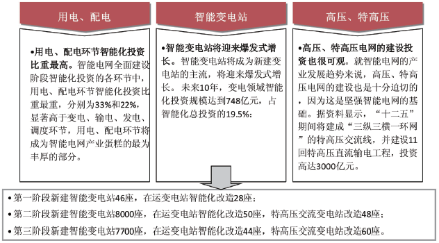 總之,在智能電網(wǎng)的整個(gè)建設(shè)階段,特高壓始終是主旋律,中期的投資重點(diǎn)是電網(wǎng)自動(dòng)化,長期的投資重點(diǎn)是智能電表,而輸電側(cè)在電力系統(tǒng)各領(lǐng)域中的投資機(jī)會(huì)最為可觀。