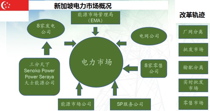 新加坡電力行業(yè)的改革歷程最早也是垂直一體化運營,國企新加坡能源公司(Singapore Power)下設發(fā)電公司、輸電公司和供電公司,1993年的電力行業(yè)改革實行“廠網分開”,發(fā)電公司從新加坡能源公司(簡稱新能源公司)獨立出來,發(fā)電市場初步放開。1998年開始借鑒英國經驗,建立電力批發(fā)市場,提高發(fā)電市場的開放程度,組建新的市場能源管理局(EMA),并設定電力系統(tǒng)的運行者(PSO),負責電網安全穩(wěn)定運行,按分電壓等級核算輸電網的使用費。當一切準備就緒,2001年開始,按照容量的大小分階段向用戶開放零售市場。截至2015年,月平均用電量在2MW以上的客戶已放開競爭,用電量約占總社會用電量的80%,目前僅剩下中小居民客戶尚未放開。