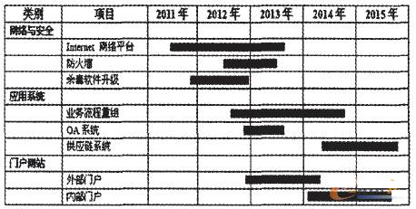 然后,將信息化建設(shè)過程分解為相互關(guān)聯(lián)、互相支撐的若干子項(xiàng)目,定義每一項(xiàng)目范圍、收益、重要性、預(yù)計(jì)成本、時(shí)間、資源等等。根據(jù)這些因素對(duì)項(xiàng)目進(jìn)行評(píng)分。根據(jù)分?jǐn)?shù)高低進(jìn)行排序。最終形成企業(yè)的項(xiàng)目實(shí)施計(jì)劃、年度投資計(jì)劃、培訓(xùn)計(jì)劃、管理計(jì)劃等活動(dòng)。以下是某企業(yè)的信息化五年實(shí)施計(jì)劃(部分)。