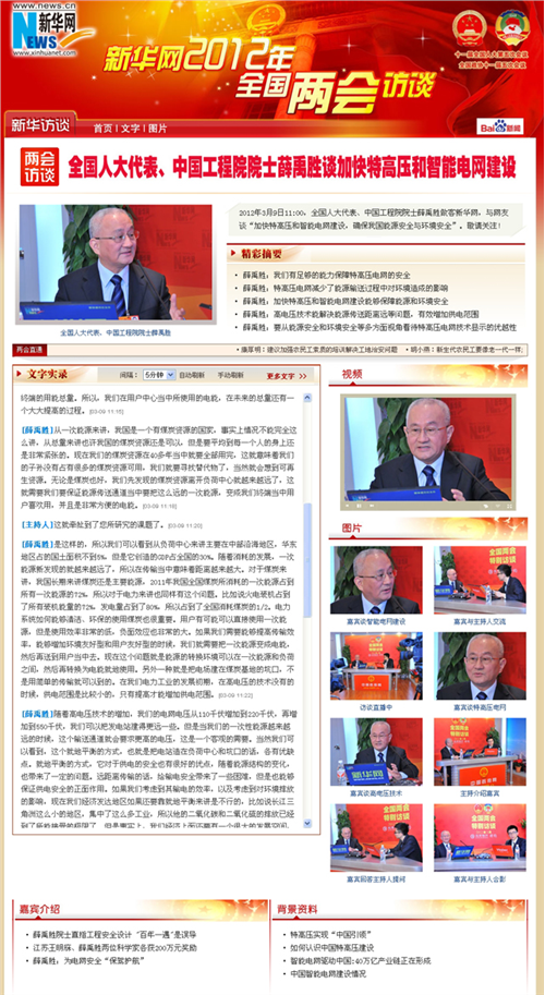 2012年3月9日11:00,全國人大代表、中國工程院院士薛禹勝做客新華網(wǎng),與網(wǎng)友談“加快特高壓和智能電網(wǎng)建設(shè),確保我國能源安全與環(huán)境安全”。