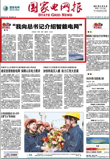 3月9日,《國家電網(wǎng)報》頭版頭條刊登了題為《我向總書記介紹智能電網(wǎng)》的新聞,報道全國人大代表、國網(wǎng)電力科學研究院名譽院長薛禹勝院士在兩會上作題為發(fā)展堅強智能電網(wǎng),保障環(huán)境能源安全的發(fā)言,向胡錦