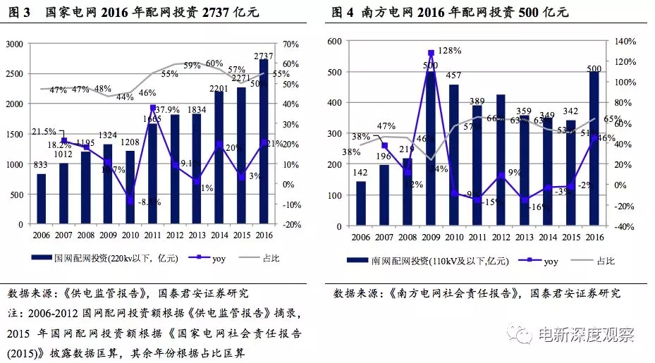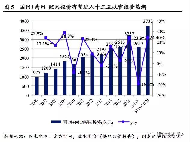2018-2020年我國配網(wǎng)投資仍有萬億空間、年均投資3733億元,同比市場預(yù)期的年均3000億元投資仍有24%以上增速。①2015年國網(wǎng)配網(wǎng)投資約2271億元,南網(wǎng)配網(wǎng)投資342億元,兩大電網(wǎng)公司總共投資2600億元,略低于之前規(guī)劃的3000億元,我們認(rèn)為主要是《行動計(jì)劃》是當(dāng)年7月發(fā)布的,因此實(shí)際投資相對于國網(wǎng)南網(wǎng)年初制定的建設(shè)采購計(jì)劃有所滯后;②2016年國網(wǎng)配網(wǎng)投資約2737億元,南網(wǎng)配網(wǎng)投資500億元,兩大電網(wǎng)公司總共投資3200億元,主要是《行動計(jì)劃》等政策指引帶來的配網(wǎng)投資熱潮,2017年我們保守預(yù)計(jì)與2015年持平,根據(jù)《行動計(jì)劃》要求的2016-2020年累計(jì)1.7萬億元投資,因此2018-2020年三年時(shí)間累計(jì)投資仍有1.12萬億元空間,年均3733億元,同比市場預(yù)期的3000億元配網(wǎng)投資將有24%以上增速。隨著2018年增量配網(wǎng)要實(shí)現(xiàn)試點(diǎn)項(xiàng)目地級以上城市全覆蓋,配網(wǎng)有望進(jìn)入十三五收官投資熱潮。