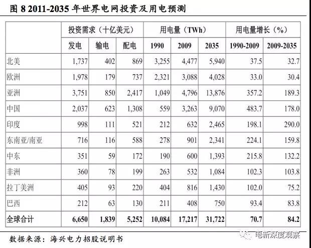 根據(jù)國際能源署《世界能源展望2011》統(tǒng)計(jì),到2035年,全球用電總量將達(dá)到317,220億千萬時(shí),較2009年增長84.2%。強(qiáng)勁的電力需求將拉動全球電網(wǎng)投資。2011-2035年全球累計(jì)電網(wǎng)投資需求將超過13.7萬億美元,其中發(fā)電、輸電、配電各部分的投資額將分別達(dá)到6.65萬億美元、1.84萬億美元、5.25萬億美元。2025年美國電網(wǎng)投資缺口中配網(wǎng)部分占54%,約為955.8億美元,占到2011-2035年全球配電累計(jì)投資額的1.8%。