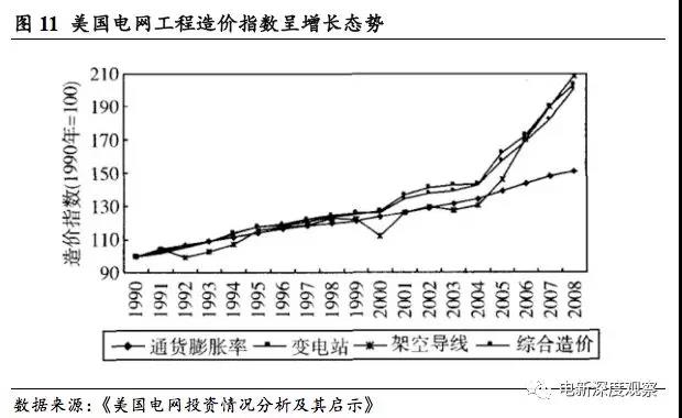 美國電網(wǎng)建設(shè)成本呈現(xiàn)上漲態(tài)勢。①電源結(jié)構(gòu)變化提出長距離輸電線路建設(shè)需求:可再生能源如風(fēng)電、地?zé)岚l(fā)電裝機(jī)增長較快,出于環(huán)保和燃料供應(yīng)的考慮,這些電廠一般都遠(yuǎn)離負(fù)荷中心,需要新建長距離輸電線路,直接推動(dòng)了輸電網(wǎng)投資的上升。②電網(wǎng)項(xiàng)目建設(shè)成本上漲。原材料、土地、人工成本的上升都給電網(wǎng)項(xiàng)目建設(shè)造成很大的成本壓力。