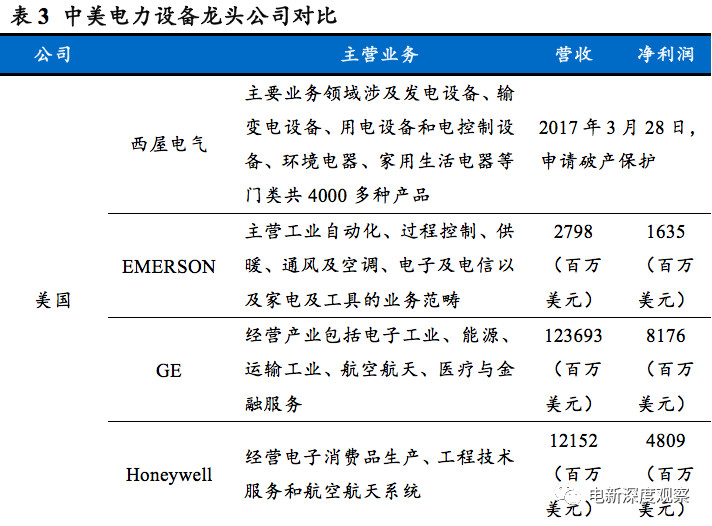由于1975-1999年的20多年美國輸變電主網(wǎng)投資額處于停滯狀態(tài),因此美國電力設(shè)備龍頭均呈現(xiàn)多元化的業(yè)務(wù)結(jié)構(gòu)。通過中美電力設(shè)備龍頭公司的對比,美國電力設(shè)備公司與中國電力設(shè)備公司均在其傳統(tǒng)業(yè)務(wù)領(lǐng)域存在明顯瓶頸,美國電力設(shè)備龍頭多向其他領(lǐng)域轉(zhuǎn)型延伸,因此業(yè)績規(guī)模較大,中國電力設(shè)備龍頭的業(yè)務(wù)尚未多元化,業(yè)績規(guī)模相對較小。