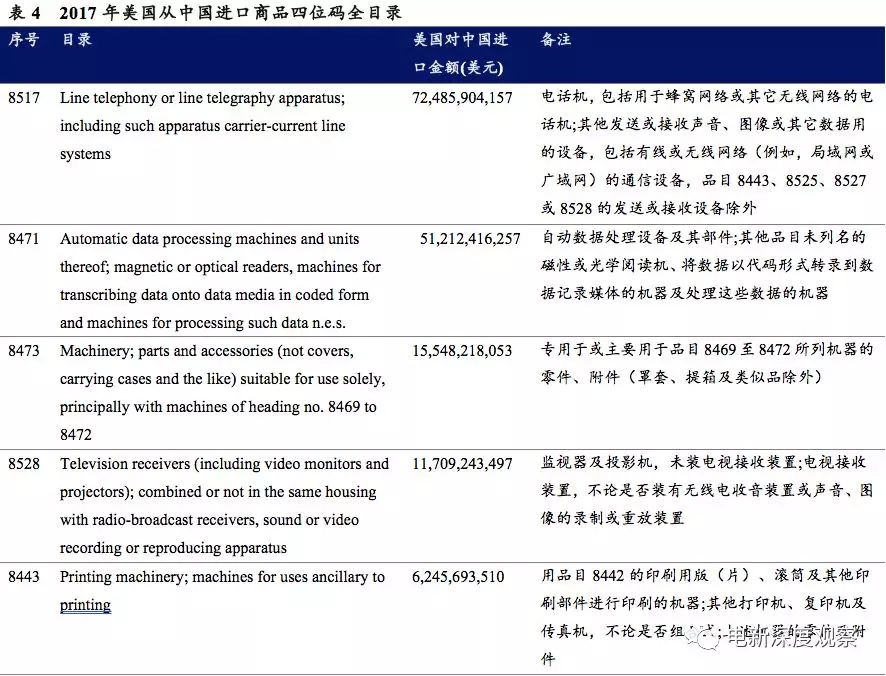 美國從中國進(jìn)口商品主要以有線電話、電報(bào)機(jī)、數(shù)據(jù)處理設(shè)備、監(jiān)視器、投影儀為主。1)據(jù)聯(lián)合國商品貿(mào)易統(tǒng)計(jì)數(shù)據(jù)庫,2017年美國從中國進(jìn)口金額